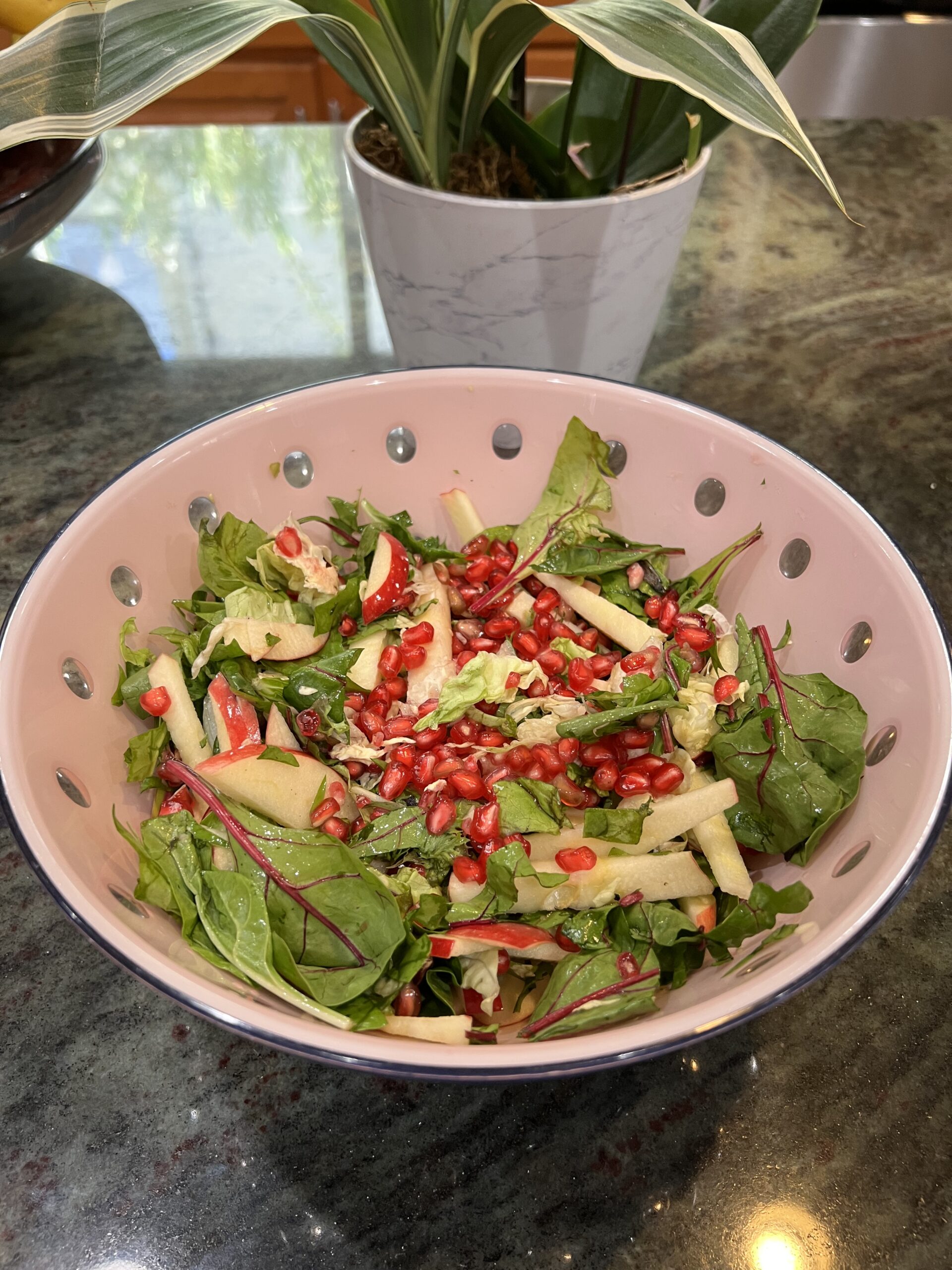 Put the mix greens and the lettuce in a salad bowl, add the sliced apple, pomegranate , Mix all the dressing ingredients in a shaker jar and add to the bowl. Mix it all together, and can add walnuts or pecans on top.