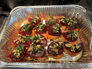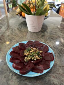 Heat 3 cups of water in a medium pot, add a little salt, put the beets inside and cook them until they are soft (about 50 minutes). Meanwhile, cut the mixed greens to large pc and put them in a medium salad bowl. Cut the oranges into thin wedges and add them to the bowl. Put the juice that is left from cutting the oranges in a small bowl (need 2 tbs), add the olive oil, mustard,salt and pepper, mix, and set Read More