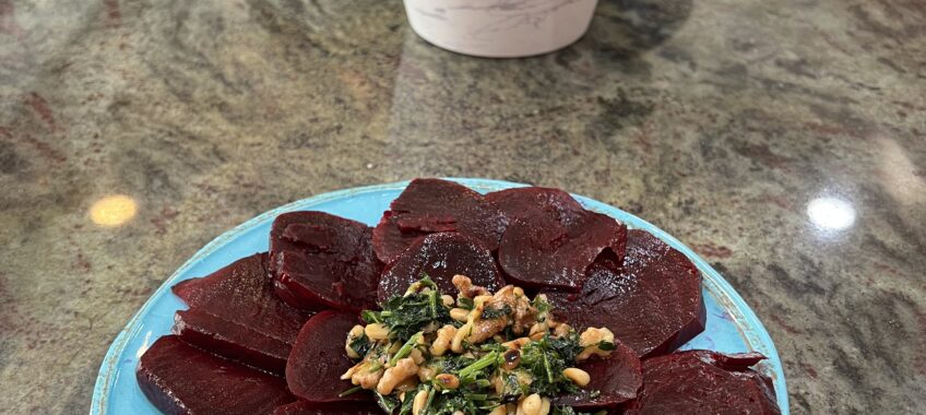 Peel the beets and cook them whole in a pot with hot water for an hour until soft. Remove and slice into very thin slices (can use mandolin), arrange on a plate. In a medium pan heat 2 tbs olive oil, add the walnuts and pine nuts, add the parsley (slice it before)mix all for about 2 minutes on medium heat, add salt and pepper, and remove from heat. Add the parsley and nuts to the center of the plate with the beets.