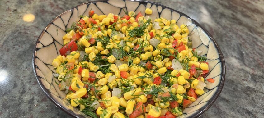 Put the corn without the water in a bowl. Cut the bell pepper and the pickles into small cubes and add them to the bowl. Cut the dill into small pc , add them to bowl , and then the olive oil, salt, and pepper.